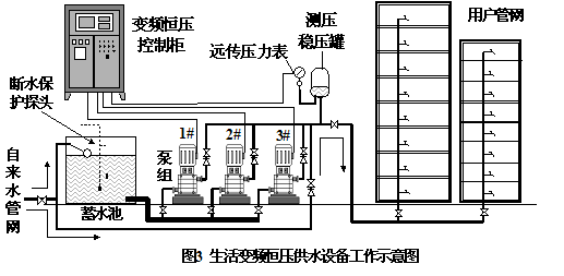 該設備以水泵出水端水壓(或用戶用水流量)為設定參數,通過微機自動控制變頻器的輸出頻率從而調節水泵電機的轉速,實現用戶管網水壓的閉環調節,使供水系統自動恒穩于設定的壓力值:即用水量增加時,頻率提高,水泵轉速加快;用水量減少時,頻率降低,水泵轉速減慢。這樣就保證了整個用戶管網隨時都有充足的水壓(與用戶設定的壓力一致)和水量(隨用戶的用水情況變化而變化)。