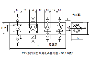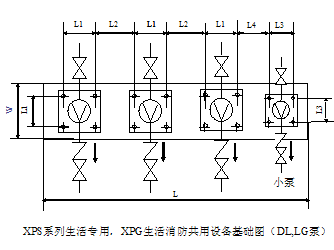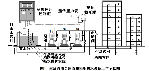 該設備與XPS生活專用型設備相比,基本組成相同,不同的是:具有兩個恒壓值,高低壓差0.1~0.25Mpa內任意設定。平時低恒壓運行滿足生活供水要求,發生火災自動轉入高恒壓,同時關閉電磁閥,只對消防管路供水達到消防供水要求。該系統要求泵組選擇能夠滿足消防要求。系統圖(以三臺主泵為例)見圖4