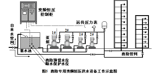 XPX型消防恒壓供水設備系采用智能控制器或可編程控制器(PLC)對變頻泵組、穩壓泵進行控制。XPX型消防供水設備可接受消火栓火警信號、水流指示信號、消防控制中心指揮信號、水噴淋報警閥信號、消防水箱液位信號、壓力開關信號等各種信號來自動起動消防水泵,并由水壓反饋信號來決定投運水泵的時間和臺數,以滿足消防供水的需要。該系統平時由穩壓泵(或消防穩壓系統)維持系統壓力,使管網始終處于消防所需的工作壓力;當火警時,穩壓泵不能維持設定壓力而降至某壓力值時,自動起動一臺消防泵,如壓力繼續下降,再起動二#臺泵,其中任一臺泵有故障,備用泵自動投入運行。系統圖(以二臺主泵為例)見圖5。